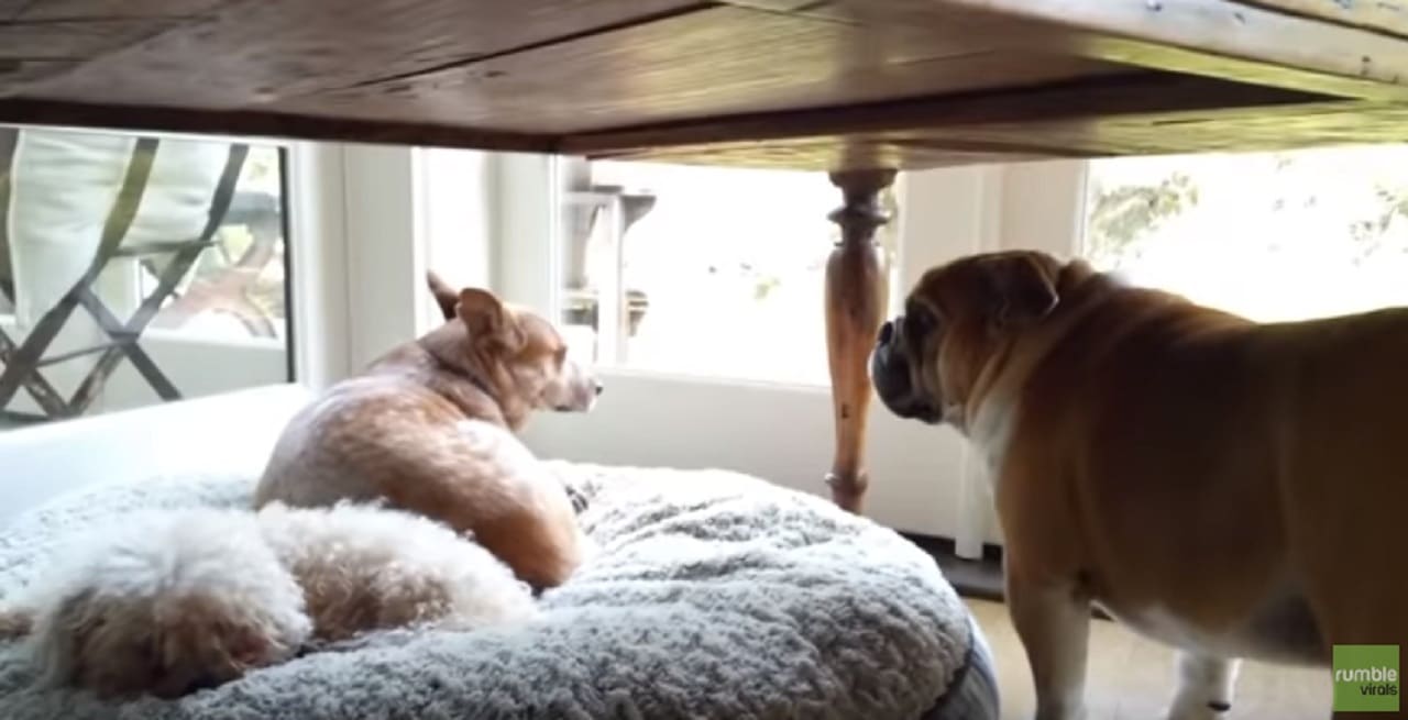 But, for Mr. Bulldog here, he cannot take his much-needed siesta time as another dog occupies his bed. So, the bulldog’s left with no choice but to show some force to make the other dog go away.